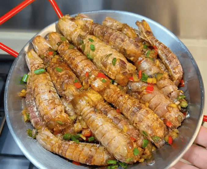 椒盐虾:虾洗净后沥干水分,裹上一层薄薄干淀粉,下油锅中炸至金黄,撒上椒盐和辣椒粉,香脆可口。