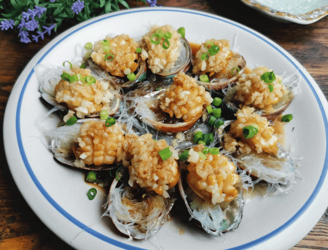 蒜蓉蒸扇贝:扇贝洗净,壳朝下摆盘,蒜蓉加少许盐、鸡精和香油拌匀,均匀铺在贝上,蒸5分钟即可。