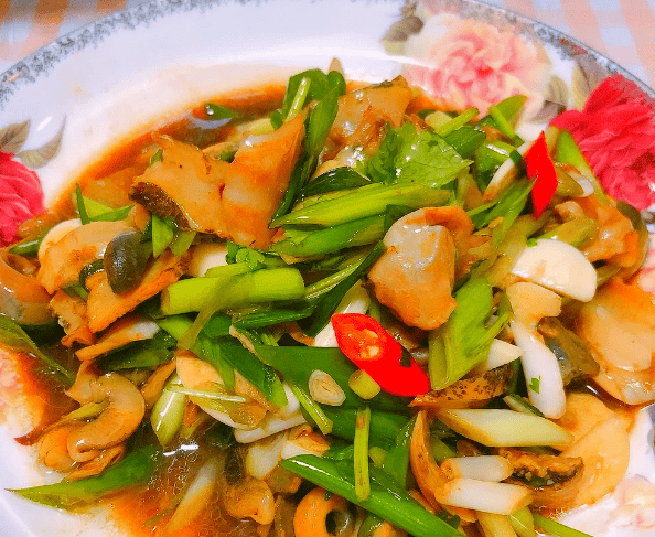 咖喱青口:青口贝洗净,锅中放少量油炒洋葱丁,再加入咖喱粉和椰奶,放青口翻炒至贝壳打开即可。